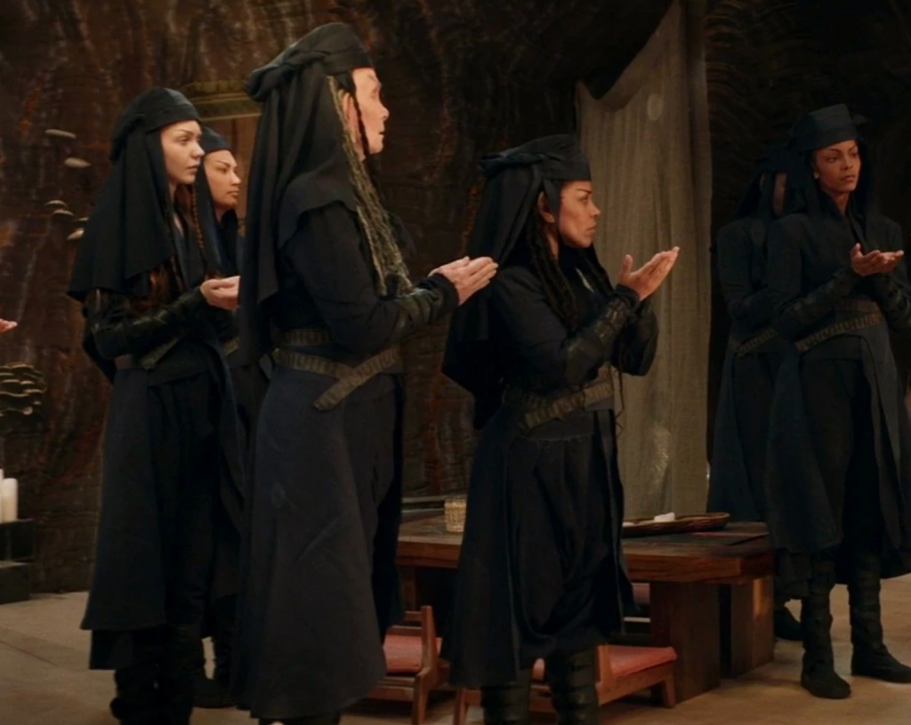 Turning to Star Trek: Picard: we’re introduced to two female-led Romulan societies, one sympathetic (the Qowat Milat) and one not (the Zhat Vash), in a way that parallels the (mostly) good and evil warrior sisterhoods in HoD/ChD (though the name “Qowat Milat” is most likely a nod to yet another warrior sisterhood, the Dora Milaje in Marvel’s Black Panther). (The Qowat Milat is explicitly said to be all-female, though they do give the male Elnor a Qowat Milat upbringing, as several of the male protagonsts in the Dune series receive a Bene Gesserit upbringing. (The Witches of Dathomir had male protegés too.) Nothing is explicitly said about the gender balance of the Zhat Vash, but while they do have at least one male operative, all the initiates we see attending the Admonition are female, as far as I could tell.) The sensual, manipulative, ruthlessly violent, psychopathically unempathetic Narissa, the Zhat Vash operative we get to know best, also acts very much like one of Herbert’s Honored Matres.