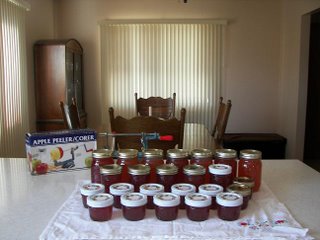 These are the neat and orderly rows of pretty jelly. I should have taken a photo of the chaos that was mere minutes before this picture was taken. I think every pot in the house was dirty. Oh, the apple peeler corer that you can see on the counter is the BEST invention ever. I don't know how I ever managed without it. Not to mention that it's lots of fun. The Man and the Man-Cub both had a lot of fun with it, too.