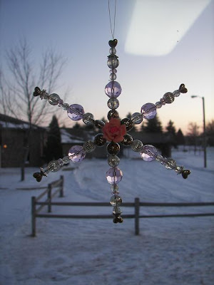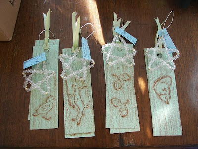 The bookmarkers were fun and easy to make - you just rub a crayon over the raised plastic image - then hole punch and tie on some ribbon - and the ornaments were a kit project from Stuff Mart - really simple - just count and string some beads on a wire and bend appropriately into a star shape...