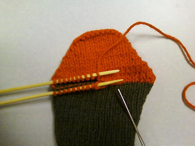 OK...we're done...now we need to kitchener stitch the sole stitches to the toe stitches and this will be much easier from the knit side of the sock...