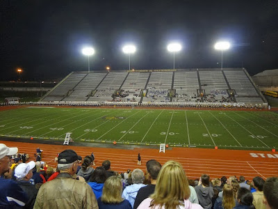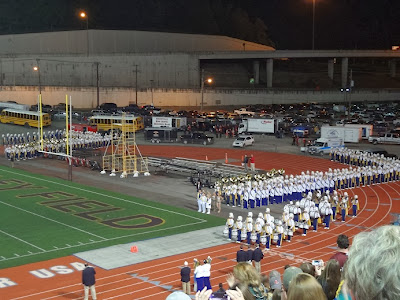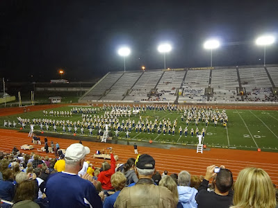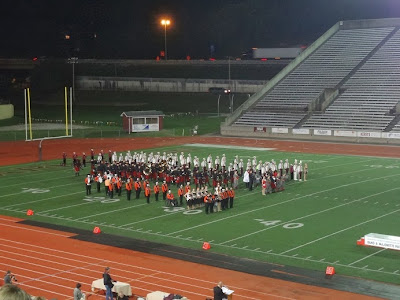 ...so...Scout spent another evening on the field...arriving at 5 PM and not leaving 'til after 10:30... ...they marched in while it was still daylight... ...and all of the bands joined together for a rousing rendition of the Star Spangled Banner... ...lined up and ready to 'take the field'... ...in position...