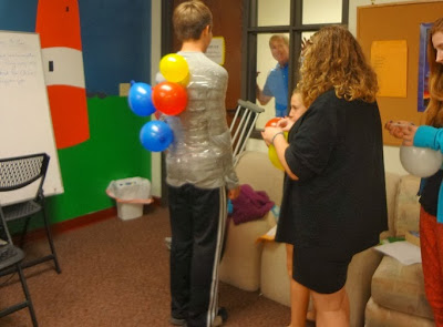 ...this team spent a lot of time covering their guy with tape...and by the time they were done the other team already had their balloons on...