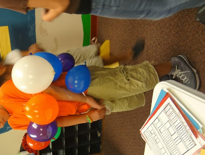 ...this team won (not sure why this photo is turned this way)...but their strategy worked best...they put on about three wraps of tape and got busy blowing up and sticking on their balloons...