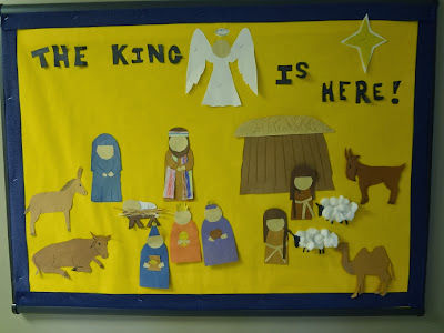 Have a little lesson about Joseph and Mary traveling to Bethlehem - cut out Joseph and Mary figures a donkey and a stable and an empty manger...and the words THE KING IS COMING...and put those on the board...I let the kids position the figures and hold them up and I just put a couple of staples in each one...you may need to move them around a bit as the weeks go on and you have more things on your board...