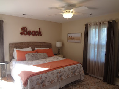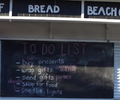 ...the Man has always wanted to celebrate Christmas at the beach...but because of his "job" we've never been able to...and this year is no different...as we won't actually be at the Beach for Christmas...but the "season" of Christmas... ...so we packed up and headed to the coast...it was a sunny 60° day... ...we arrived at our cottage and unloaded our gear in our shirtsleeves... ...our cute and sunny bedroom... ...they are building a new house/cottage right in front of this one...so the construction equipment blocks our view a little bit... ...we headed to the little grocery store just a couple of blocks away...and they have this sweet remake of a Christmas to-do list chalked on their outside wall... so sweet!...