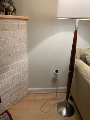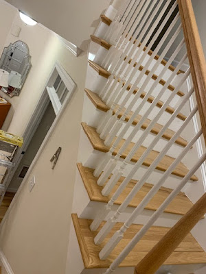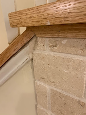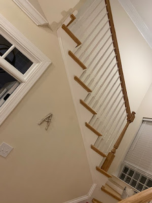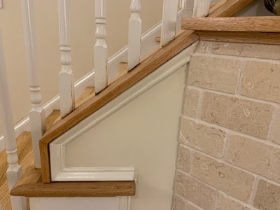...and now back to the past... ...there was a gap in the molding where we changed out the face of the fireplace...too big to leave or caulk...and we didn't want to replace the trim if we could help it...so I patched it...I'll try to sand it to the shape of the molding and then paint it... ...painted the wall up next to the limestone...trying to feather it in...you mix the paint with some water as you move out...the paint on the walls is 20 years old...and we're not planning on repainting this big room anytime soon...so Sherwin Williams mixed some matching paint for us...but of course it's not a 'perfect' match...but feathered in it seems ok... ...painted the white trim under the stairs... ...not sure what that trim piece is called though... ...sanded the patch... ...and primed it... ...and painted the baseboard along the stairs...that might also have a different name... ...just about everything looks better with a fresh coat of paint... ...so I painted the big windowsill on the landing as well... ...and we hung the 8 day clock in the foyer/entryway... ...it was the Man's Dad 40 year gift from the company he worked for all his working life...