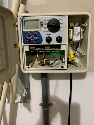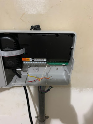 ...and a few outside things... ...our sprinkler controller died... ...a photo of the wires so we can put them in the correct place on the new controller... ...the new controller in place... ...and the wires all attached...it works!... ...just the screws on the vinyl plastic railing had rusted...so we painted those white...much improved... ...and finally we got a new battery powered edger...I had been using the weedeater runed up on it's side... ...but this is much...much better and easier...I love the nice crisp lines...