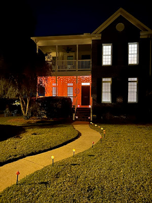 ...we put the two ceramic pumpkins that actually use candles for light down at the bottom of the steps and the row of solar-light-up pumpkins down the sidewalk...