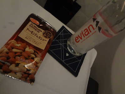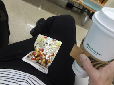 ...first snack of the day...coffee and a small conbini bag of mixed fruit and nuts...