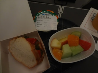 ...breakfast...the last meal of the trip arrived...it's a veggie and vegan cheese sammie...and what I thought was yogurt...and fresh fruit again...