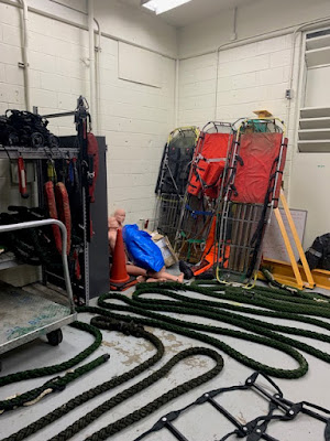 ...but I did snap one of his rescue gear...he said these hoist ropes weigh over 250 lbs...they use them for water rescue too so they are often wet...and it's a manual process to pull them back into the helicopter...as there is no room in the heli for a piece of equipment to do that...so that's a tough part of his job...