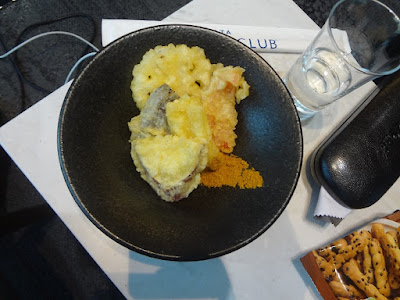 ...we played on the computer and phones for a while...and then these servers came by offering tempura vegetables...and sake...so we sampled those...
