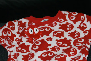 Leikkasin t-paidan tämän hupparin kaavalla (86 cm). Tarkoituksenani oli saada yksivuotiaalle kiva kesäpaita, mutta toisin kävi, paidan koko on ainakin 98 cm. Oman kolmevuotiaani mielestä paita oli tosi paha (lue: ruma), joten paita lähti neljävuotiaalle kummipojalleni, jolle oli ihan sopiva.