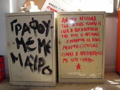 Πριν από λίγες ημέρες με σκοπό την παρακολούθηση της παρουσιάσης μιας διπλωματικής εργασίας, επισκεύτηκα και πάλι μετά από 18 χρόνια τους χώρους της σχολής μου, όπου διαπίστωσα ότι η παράδοση της αναγραφής συνθημάτων έχει μείνει αναλείωτη. Για κάποιο παράξενο λόγο, ένοιωσα ένα φοβερό ενθουσιασμό, θυμήθηκα ότι κάποτε η συλλογικότητα, επιδίωκε να κάνει το όνειρο πραγματικότητα και τέλος πάντων το όλο θέμα το βρήκα πάρα πολύ ενδιαφέρον και θέλω να το μοιραστώ μαζύ σου, γνωστέ και άγνωστε σύντροφε/φισσα του δικτυοχώρου......