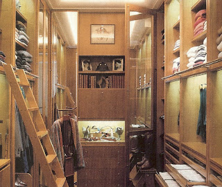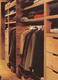 When we remodel our house a few years ago the plan called for three built in closets. One in the back side foyer, one in the guest bath and one in my dressing area. Considering the project was running a full year behind schedule and costs about three times as much as planned, we were forced to cut out a few things to get the damn thing finished and move back in. So my built-ins were sided-lined for another time. Currently chest of drawers and old wardrobe fill the spaces waiting for my build-ins to appear. Sadly, I don’t believe they will materialize anytime soon. However, a boy can still wish…here are some ideas…
