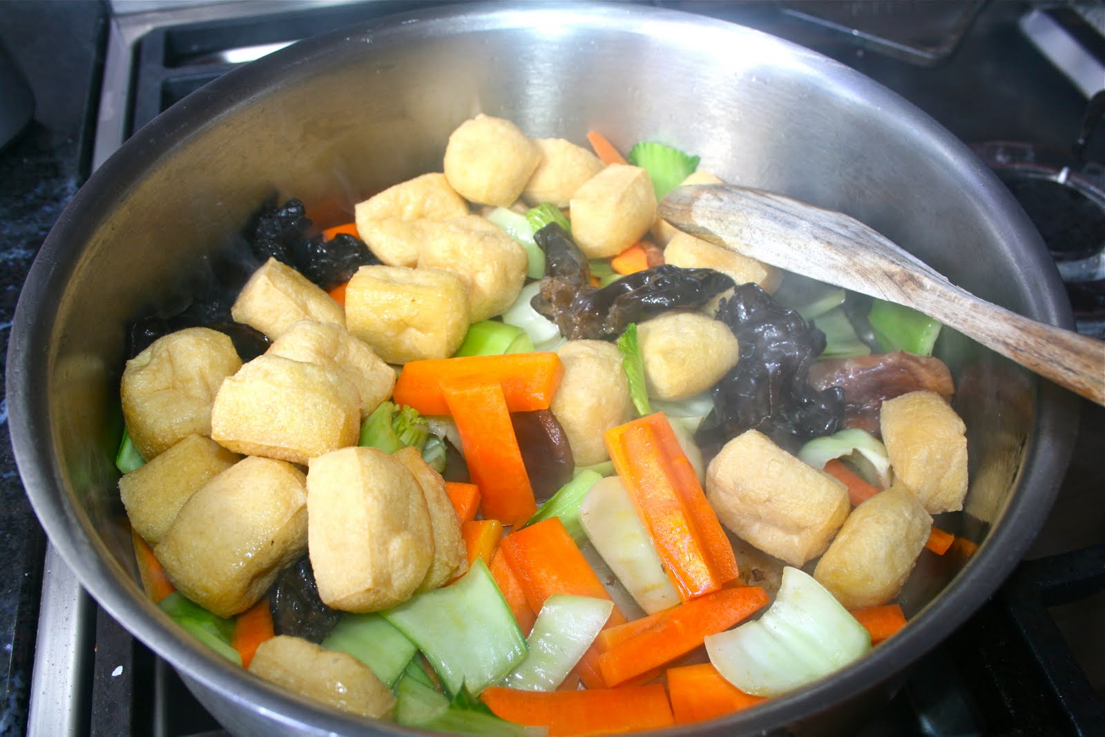 I like fried tofu balls, I get them form the Chinese shop and they are very versatile. If you find them too greasy (usually they are not) you can rinse them under water and then pat them dry with kitchen paper.