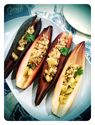 One of my banana plants has green bananas now, I read somewhere that it is good to cut the flower off, and wrap the bananas with blue plastic. I did just so, thinking that it is getting cold here, and maybe I won't get any bananas... and then I thought of, at least, eating the flower! I looked in all my books but I could not find a recipe, and yet I remembered eating banana flower salad ages ago, somewhere in Asia... I checked on the net, I found a few recipes, and the one that I most liked was this one. Of course I did a few variations, according to my taste.