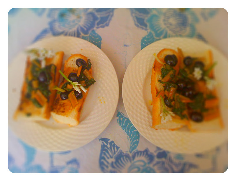 My Swiss chard/silverbeet is not big enough to be picked, but I was working in the veggie garden and I broke one entire little plant by mistake. Well, I cut it right back, and maybe it will grow again. I sauté the leaves with olive oil, some onion weed (again) and a few black olives. A pinch of salt and pepper and some grilled bread for bruschetta, and lunch for two was ready, maybe unplanned, but ready!