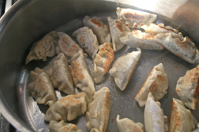 The folding is easy if you are doing it with friends. The fact is that after the first ten I got tired and bored, and I had 50 more to do! So I didn't make some particularly pretty ones to look at! My son loves them, and I wanted to make him fold a few ("so that you can learn darling!"), but he politely declined saying that he was going to take some photos of me making them instead (he is so good at finding explanations!). One of the things I do when folding the ready bought dumpling disks is to wet the borders with water so that they stick well. And then I dip (lightly) the bottom of each dumpling in a plate lined with vegetable oil. In this way the dumplings don't stick to the tray, and then to the pot (even if they are supposed to be 'pot-stickers'!)