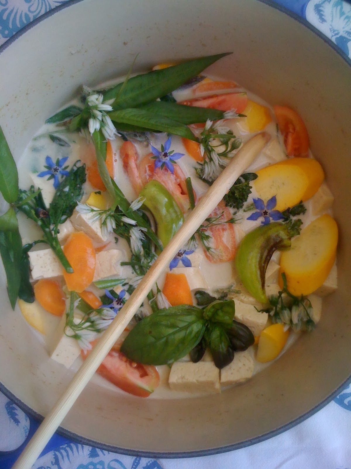 I cut the tofu and placed it in a pot with the coconut cream plus one can of water (to rinse the coconut cream can). Added the green curry paste and simmered the lot for 10 minutes and then I added the rest of the vegetables in this order: carrots, borage tips, capsicum, zucchini, broccolini, tomatoes (leave a couple of minutes between each vegetable). To stir I used a lemongrass stalk. Then I tasted for salt then I added the herbs and onion weed flowers (because they were frozen), turned the heat off and cover the pot with a lid for 5 minutes. Then I added the borage flowers.
