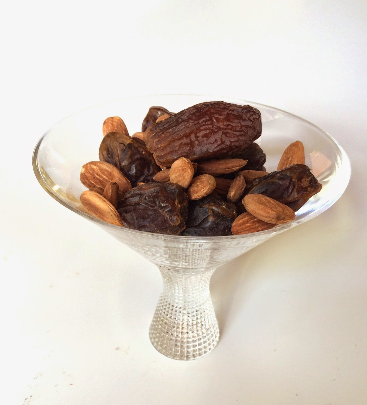 Remove the stone from the dates and break up in rough pieces. Place in a cup with the almonds and 50 ml of water. Wait for 30 minutes to let the fruit soften a little and then blend with an immersion blender.