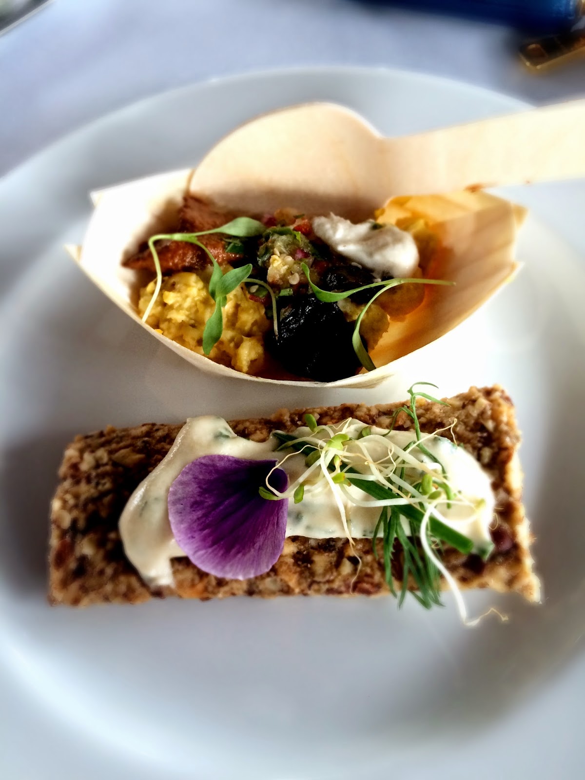 Little Bird, creates lovely food. My favourite was the nut cheese (pictured below on the raw cracker) made with soaked cashews, macadamia, water, onion, salt and lemon, plus some herbs (parsley, chives and dill) added after the blending of nuts.