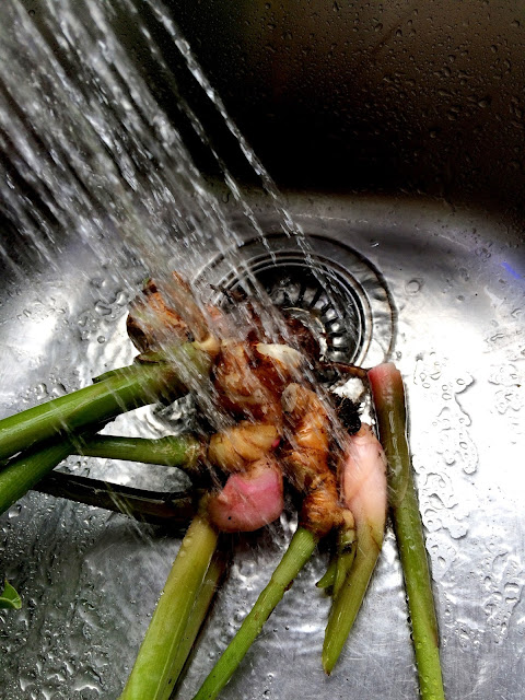 I washed my ginger roots (I could not break much of it, as I made the mistake of planting it in a pot with a lemon tree and the root was too deep down to remove completely), but I had enough.
