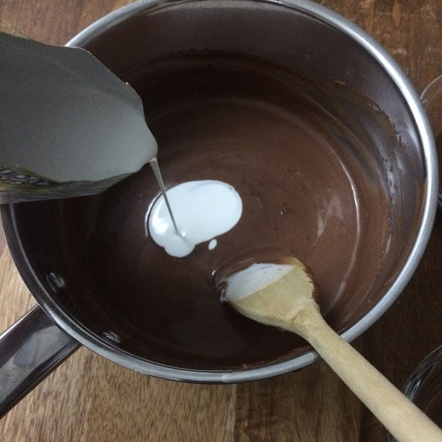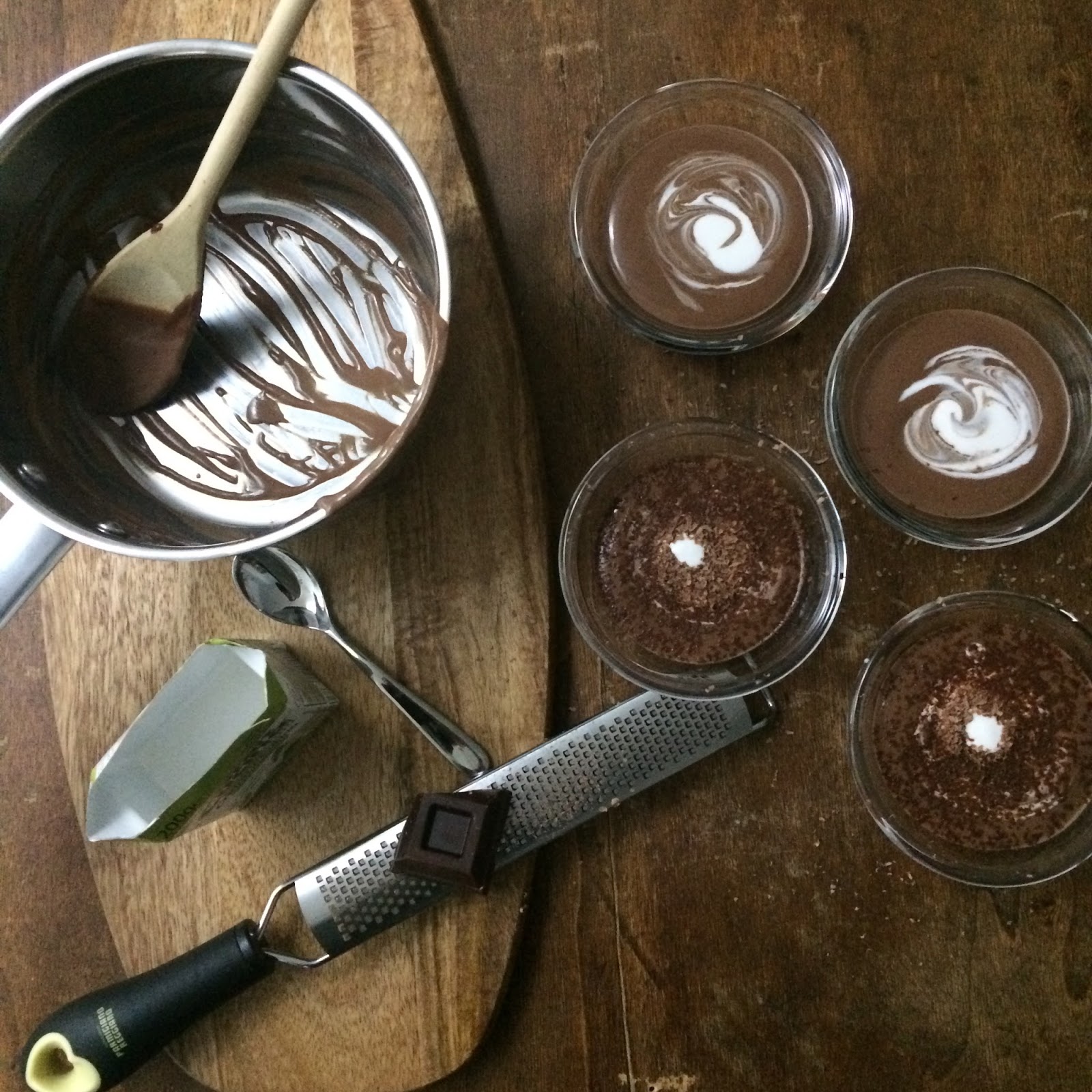 Mix the flour and sugar, add the soy milk slowly and then bring to the boil. Add the dark chocolate and stir until thick. Pour half of the mixture into the bottom of for dessert bowl (better if glass, so you will be able to see the two different chocolate layers - alternatively you can use some pretty glasses).