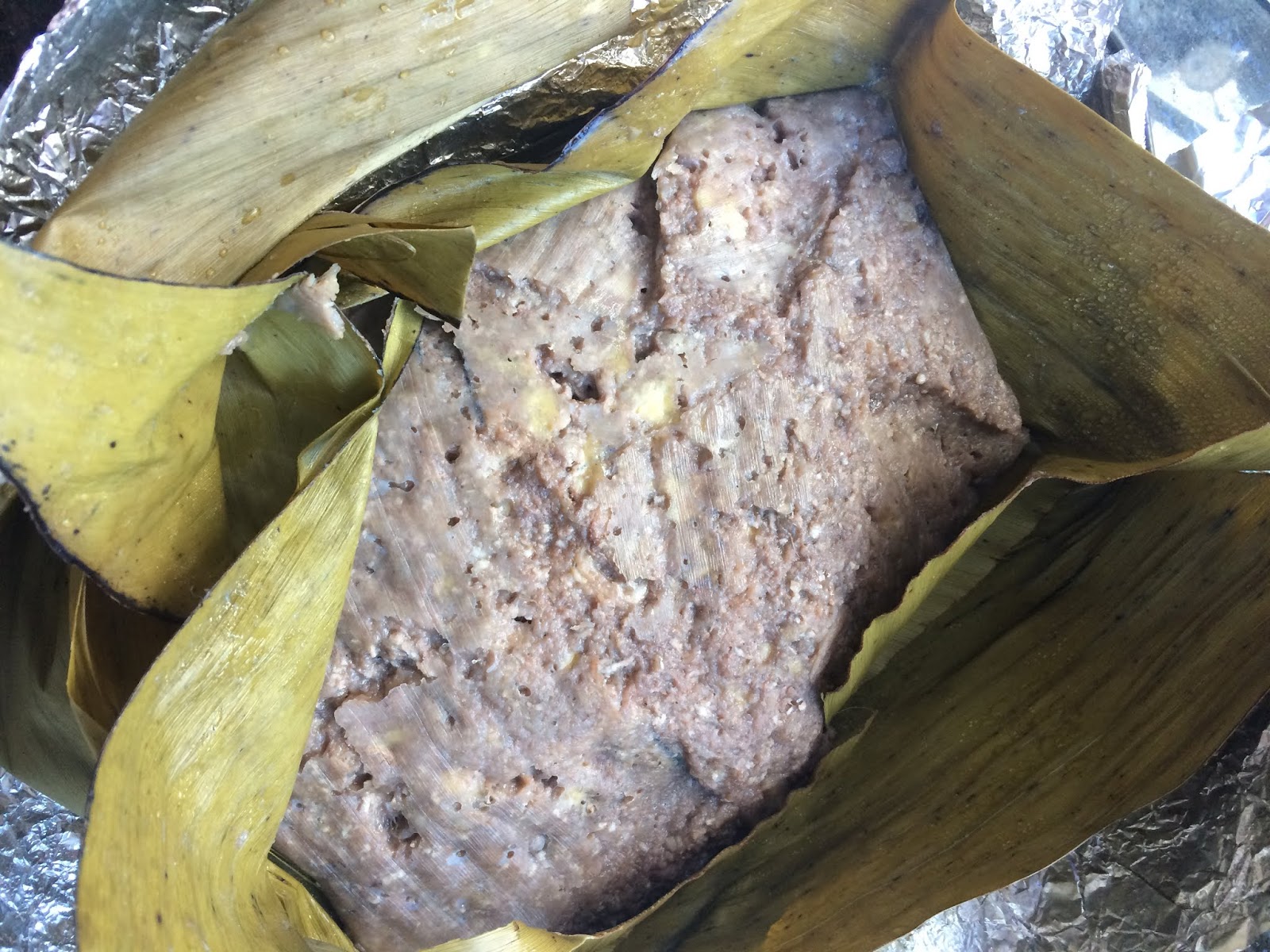 In class we used tin foil and baking paper, but at home I had banana leaves (need to be washed and scorched over a flame to soften and remove the central vein to soften. I used the banana leaves to wrap, and then also tin foil on the outside.