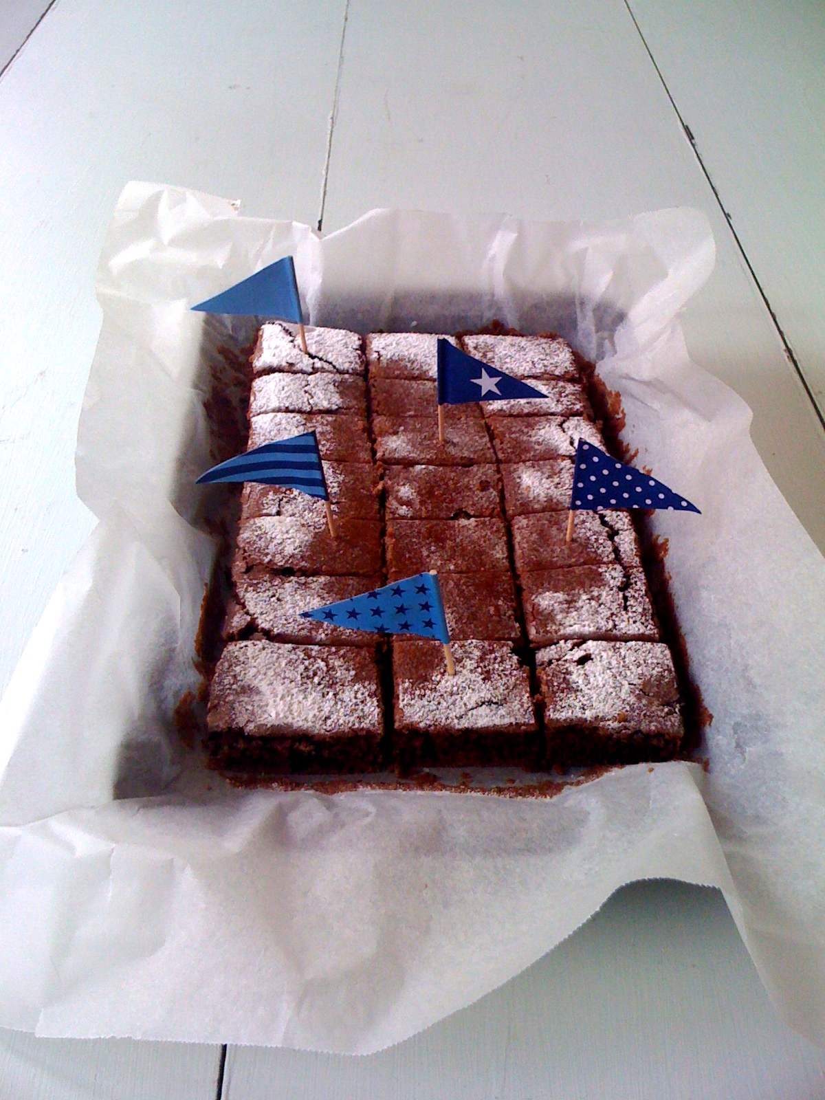 Gently heat the chocolate-hazelnut spread until is soft (not melted) enough to make it easier to fold in the rest of the ingredients. Start with the ground almonds first, then add the sugar, half of the soy milk and half of the flour. Fold in the rest of the ingredients (if it looks too thick add a bit more soy milk) and the chocolate, then pour into a square or rectangular baking tin lined with baking paper. Bake at 160 C for about 30 minutes, or until the surface looks cooked but the centre is still a little soft. Dust with icing sugar (optional) and set aside to cool down. Cut only when completely cold and set (in fact wait for a day if you can!).
