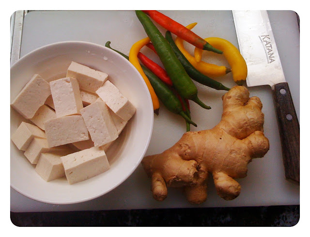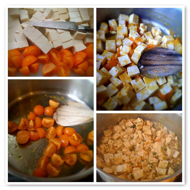 When the tomato is starting to mush add the tofu (use a firm type), cubed. Sauté on all sides then add two tbs of soy sauce (I use Japanese sou sauce).