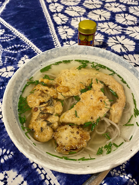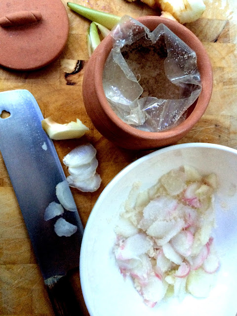 I started cooking bamboo shoots when I was living in Japan, they were different kind, much 'fatter' but these are good too, better than buying canned bamboo! Peel off the outer green layers, then cut into slices (I also like to cut the tips into two to see the layers), and discard the hard nodes. Rinse and cook for about 20 minutes in the water left over from rinsing rice (or add a little rice bran to your cooking water, I don't have rice bran so I keep the rice rinsing water), a pinch of salt and a chili (optional, but apparently it takes away the bitterness). 20 minutes suffice for small tender shoots, but if you have longer ones just make sure that you can pierce them with a knife or leave 5 minutes longer. If not using immediately store in lightly salted water.