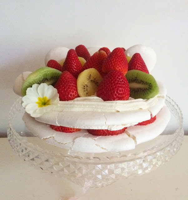 I didn't end up assembling the 'Pavlova' until the day after, but the meringue was still good and the cream nice and stiff. I only put fruit in between the two layers, and reserved the cream only for the top. Possibly the disks were too large and they cracked a little, the smaller meringues looked great and made me plan for macaroons.