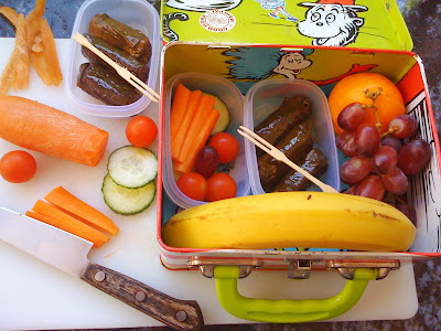In Winter the lunch boxes are a bit repetitive: mandarins, banana, carrot sticks and grapes seem to dominate, and I occasionally buy cherry tomatoes even if they are grown in hothouses (but so are most cucumbers, I guess). The dolmas came from a can, a very occasional purchase, but it does add variety and, yes, the kids love those too!