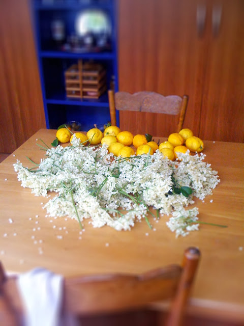 For this you will need 1 l of water, 1 kg of sugar, about a dozen elderberry flower heads, 30 g of citric acid and 3 organic lemons (I picked some juicy organic lemons from Regina's garden).