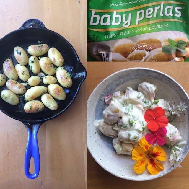 Baby perlas potatoes two ways: hot 'in padella', and salad with flowers