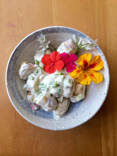 I boiled them first (no mint... just cannot bear minted potatoes, sorry Kiwis!) and then I divided them: half I used for salad, I picked the 'bigger' ones and cut them into two pieces, then I mix them with Vegan mayonnaise (recipe here), chopped onion weed bulbs and stalks, nasturtium buds and petals, and Impatiens' petals.
