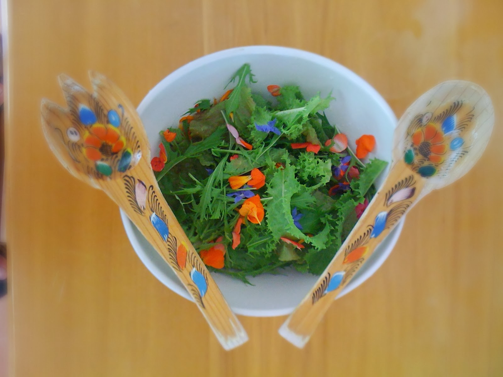This salad doesn't require much explanation: I have mixed salad leaves (lots of mizuna this year) and an variety of flowers. Did you know that you can eat impatient (busy lizzy) flowers too? They taste a bit like rocket, the best for me are the red ones, but the pink ones are so pretty! Mix and dress with extra virgin olive oil, lemon juice and salt.