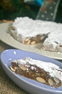 8. Remove the cooled (and now very firm) Panforte from the baking tin. Peel off the parchment. Roll the sides of the Panforte in the remaining half of the spice mixture to seal.