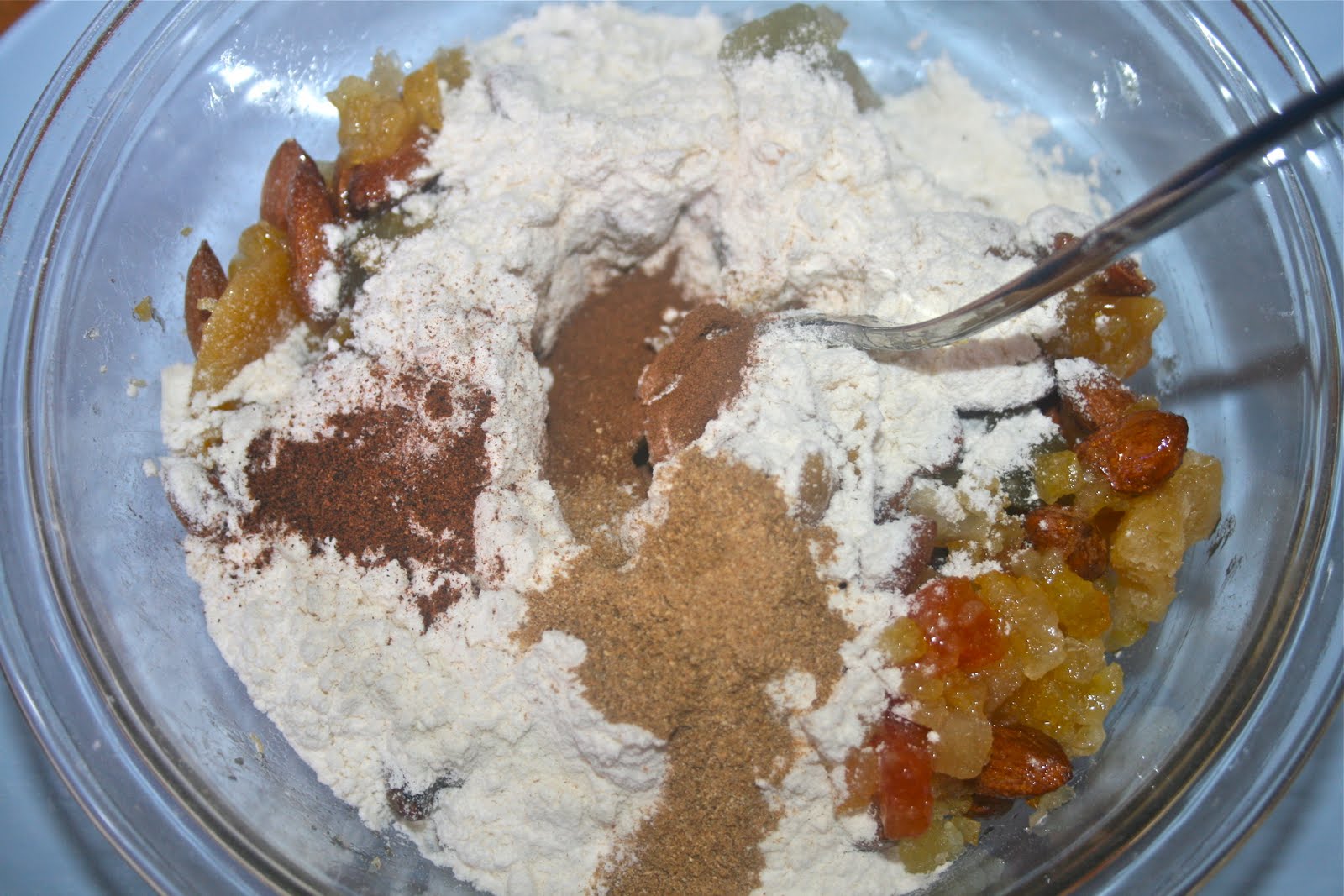 7. Glaze the cake: brush the syrup all over the top. Combine the dry ingredients and sprinkle half over the top. Press down with a spoon to seal in the stickiness.