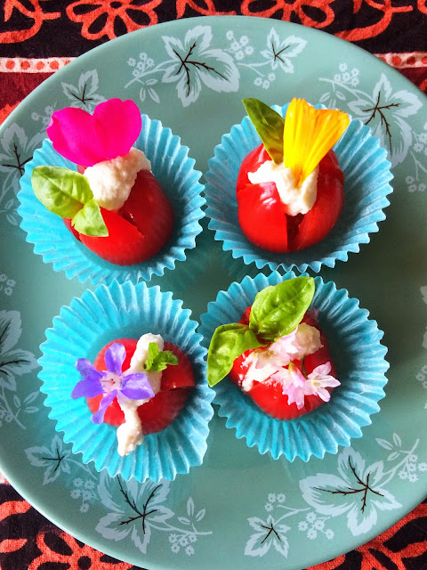 After the raw vegan mushroom and nut macaroons here is another cute raw vegan appetizer! Make a cross incision at the base of cherry tomatoes, stuff with some raw vegan nut cheese (recipe here) and decorate with herbs and edible flowers. They taste so good and are incredibly pretty!