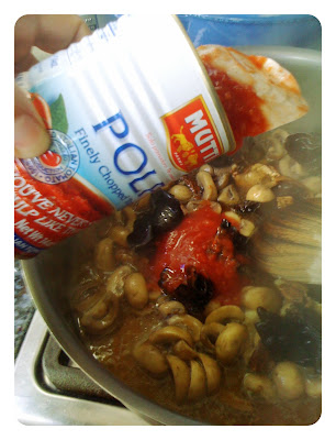 After 5 minutes I added the content of a can of finely chopped Italian tomatoes, and some more water from rinsing the can (another 400 ml).