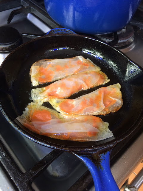 The secret is not to overcook the slices: first they will bubble up a bit, and you want that, get some air in to keep them soft. As soon as you see the edges drying turn over the slices and fry the other side for even less time, otherwise the sun-dried tomato paste will burn. If the oil becomes too contaminated with burned paste you will need to change it.