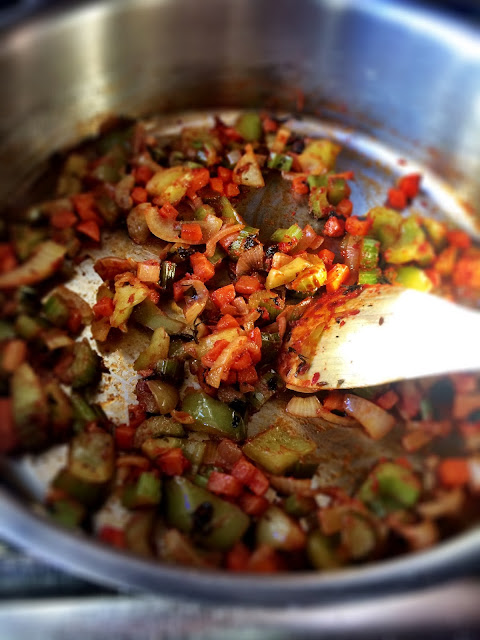 Sizzle the vegetables with two tbsp of olive oil until the onions are soft, then add 1 tbsp of tomato puree, and if you like a little smoked paprika or a chili. Stir and sizzle for one minute.