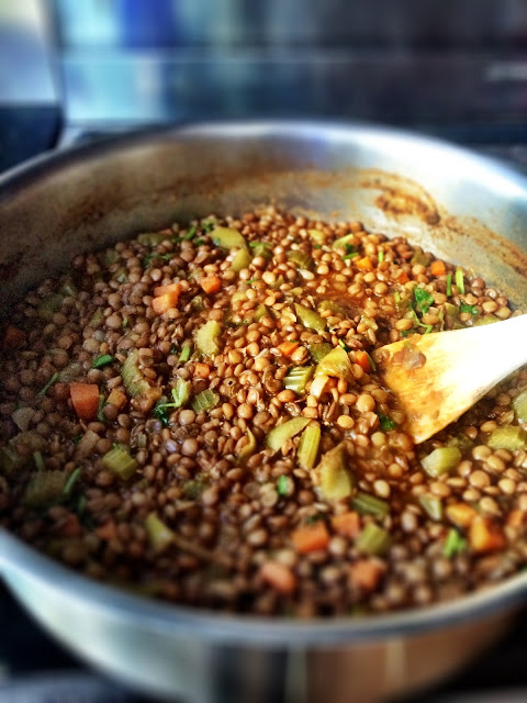 Cover and simmer until most of the liquid is gone and you are happy with the consistency of your lentils. Add salt and pepper to taste, plus a drizzle of extra virgin olive oil, and serve.