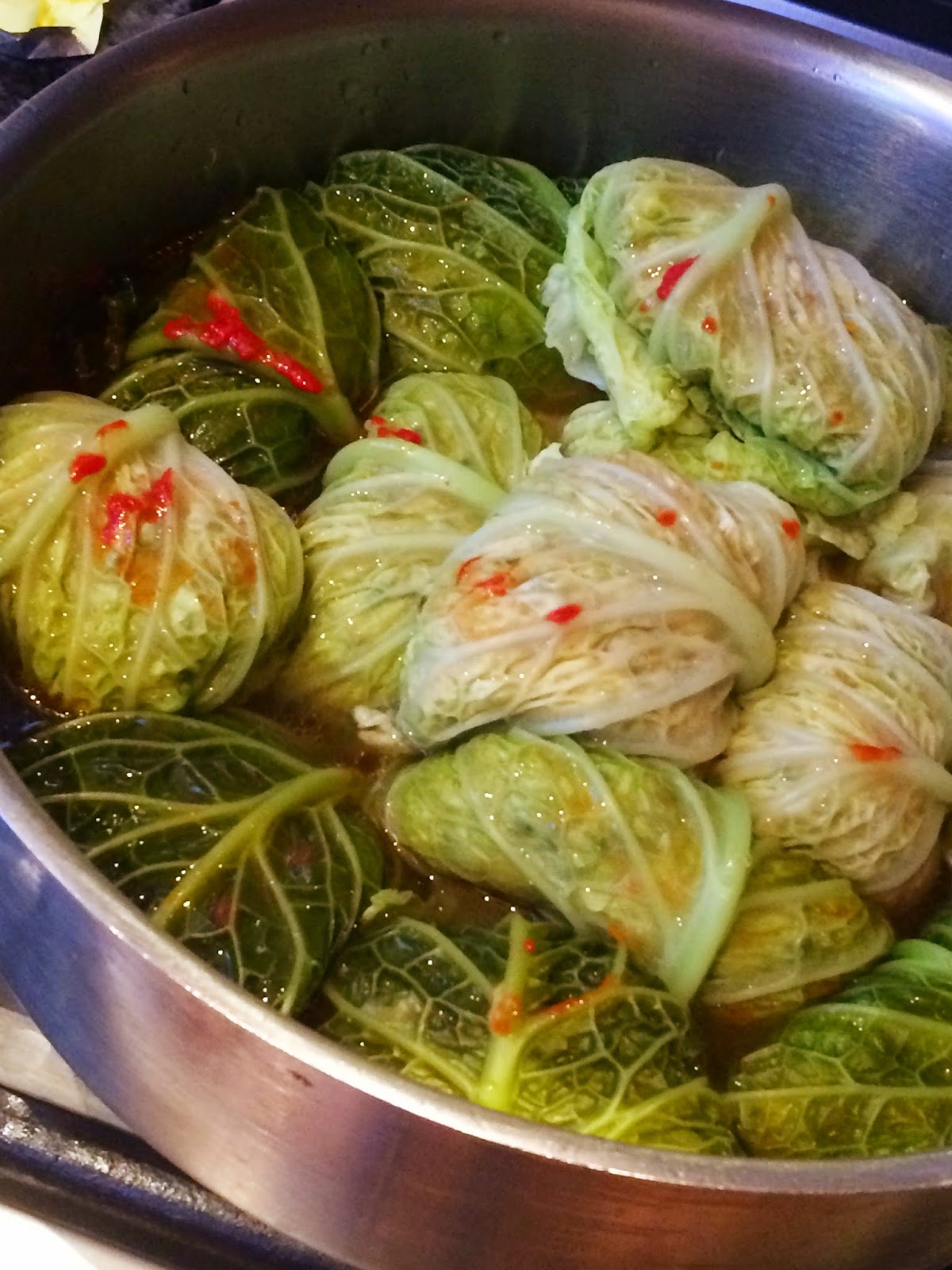 Cabbages are cheap and healthy, and when I buy one I can cook with it for a family of four for three days! Usually I start with cabbage rolls, to use the larger leaves, and these can be done in a zillion ways! There is another  good Vegan recipe here, but today for the filling I used stale bread. But first thing first:
