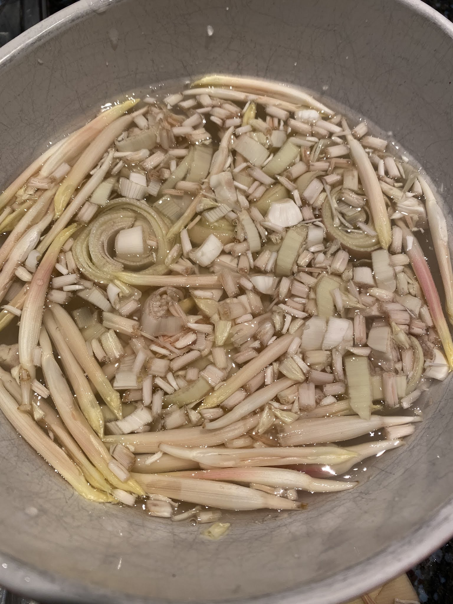 Prepare another bowl with water and lemon juice and cut the banana 'heart' into small slices, dropping them quickly into the lemon water so that they don't brown. If you want to add the flowers you will need to remove the style and stigma, and the papery outer part of the flower. This takes a long time and this is why I only do it for a few of the most tender flowers. The more central flowers, which are completely white (no pink) can be eaten whole.