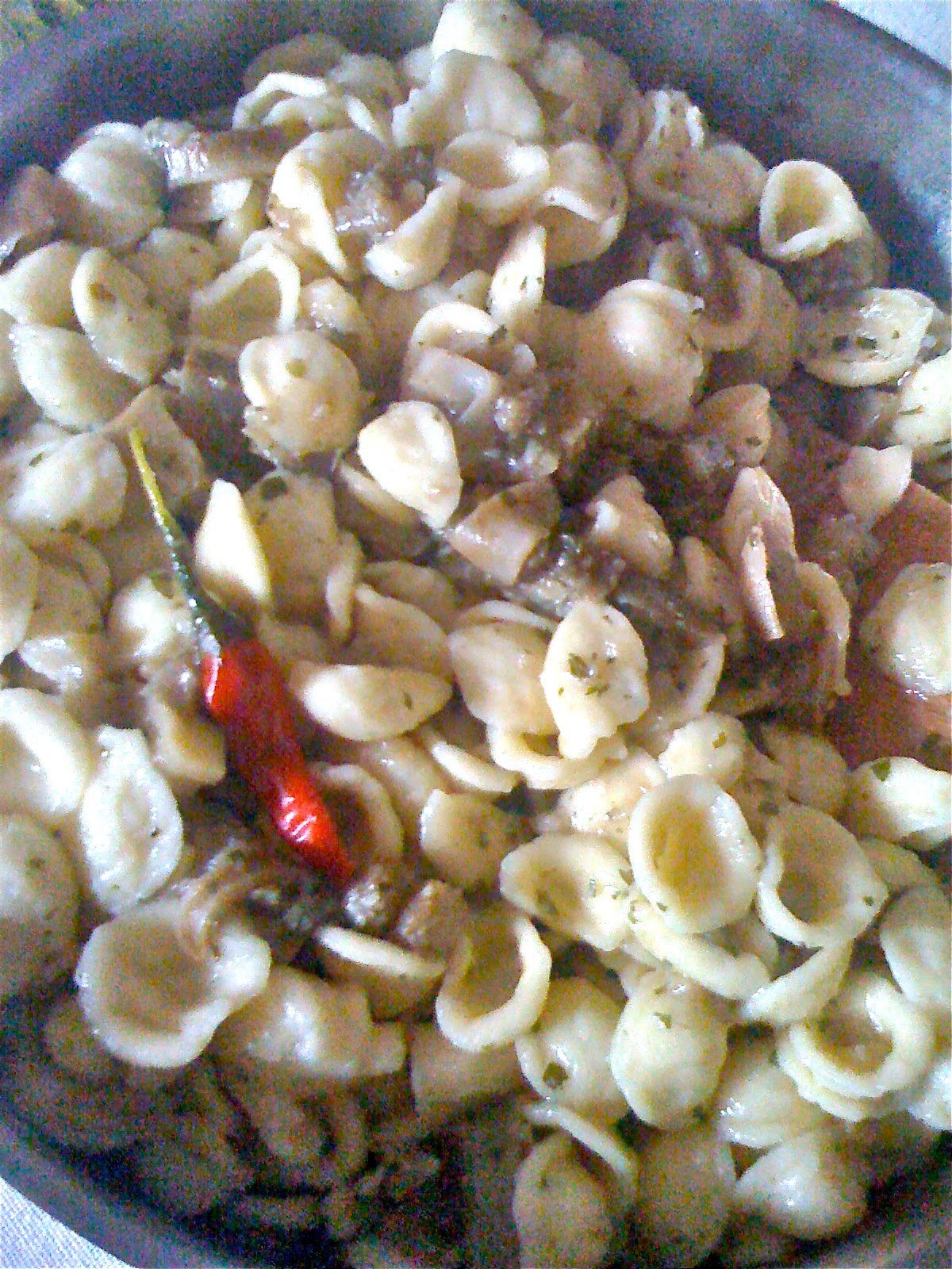 Put the chili and garlic in a pan with olive oil, fry for a few minutes and then add the eggplants, cubed. Stir often until the eggplants start to colour. Add a little water and salt and cover with a lid. Stew the eggplants, stirring often and adding water if necessary, until they are soft. At the end add half a cup of chopped parsley, a little olive oil and, if you like, some more chopped garlic and even chopped chili (but only if you like it super spicy!). Cook and drain the orecchiette pasta and then dress with the eggplants.