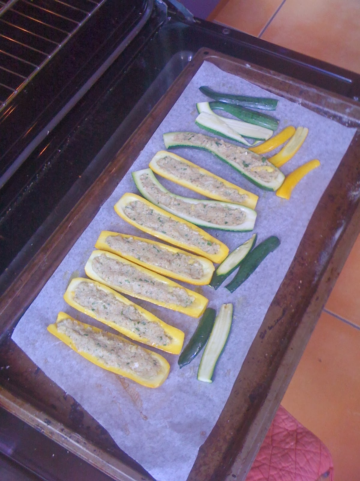 I cut them into two and scooped out the flesh. Then I baked the shells upside down with a pinch of salt and a drizzle of olive oil for 15 minutes. In the meantime I blended the zucchini flesh and then added chopped parsley and chives (about 1 tbsp), salt and pepper, a tbsp of olive oil and enough breadcrumbs to make a stuffing (add the breadcrumb one tbsp at the time so that you don't add too much). The zucchini were fresh from the garden and therefore they were very moist, so I needed more breadcrumbs, but if you buy them they may be a few days old and more dry, so less breadcrumbs are needed. I removed the zucchini from the oven, turned them up and filled them tightly with the stuffing.
