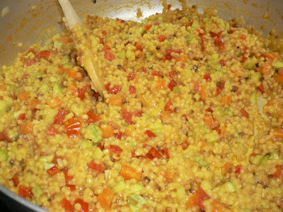 We cooked the fregola like a risotto. First chop and saute some fresh vegetables,